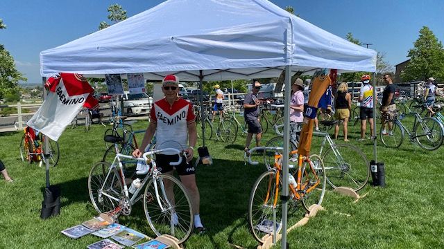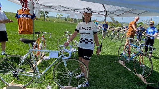 Rich and Sue were playing dress up at the Eddy Rando in Parker. Over 100 vintage bikes. Rich won Best Eddy for his Faema tribute bike which Eddy rode in his first Tour de France win. Sue’s Peugeot won first place in the newer category. The Peugeot tribute was a 1967/68 bike Eddy won his 1st Worlds on. Both bikes were built and painted by Rich and are exact down to the last bolt. I was able to braze and paint some parts of the Peugeot under a very watchful eye. Rich was asked for a bunch of autographs too!