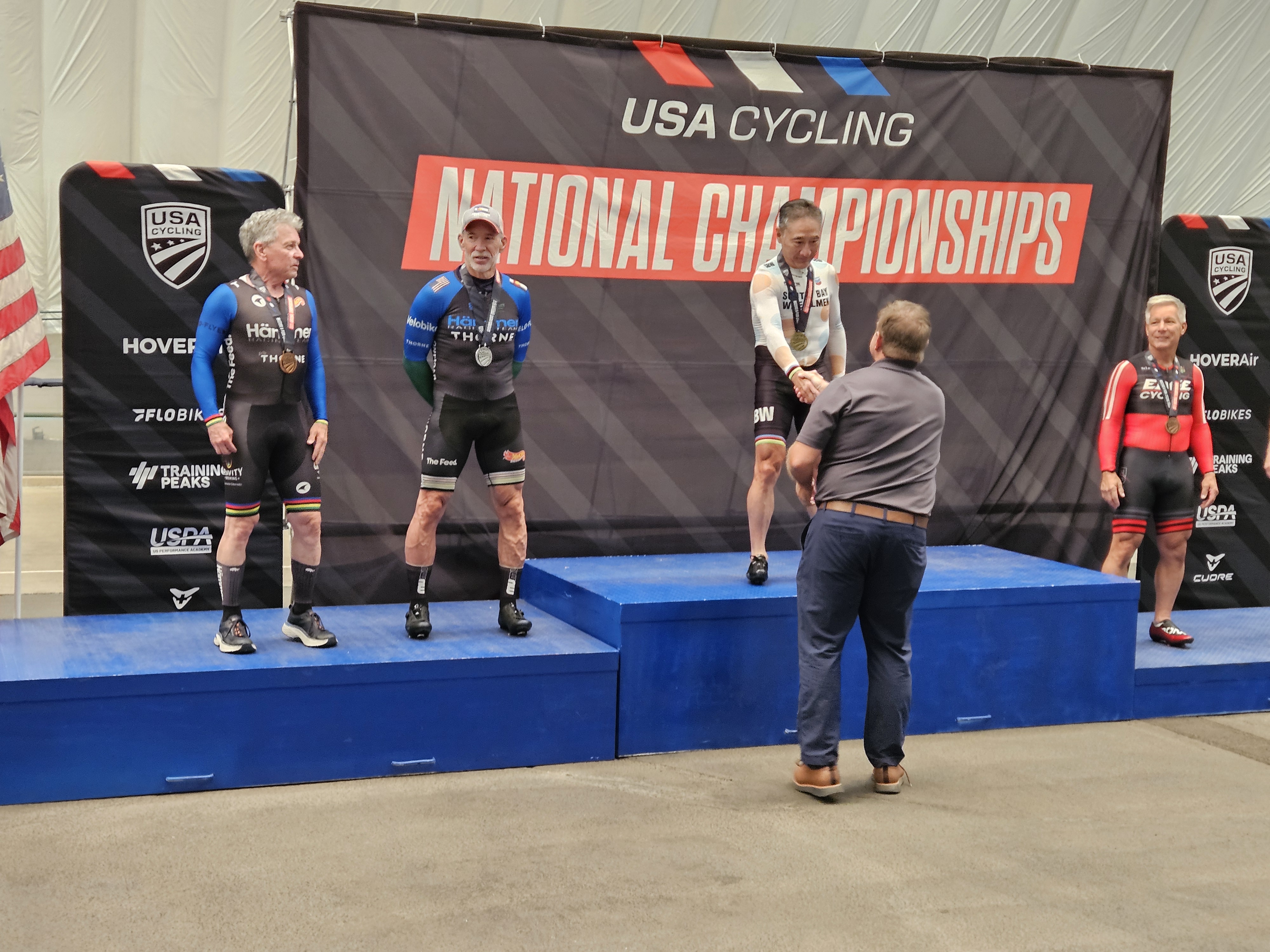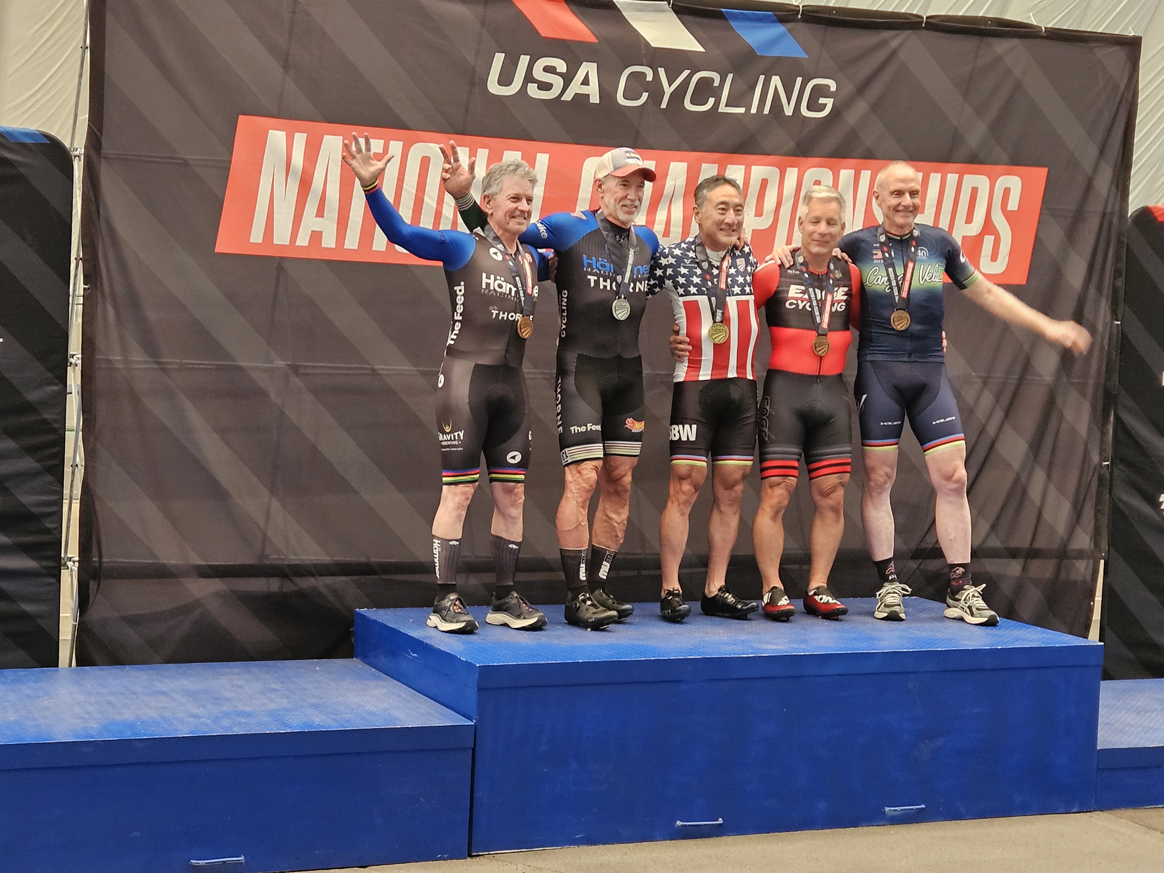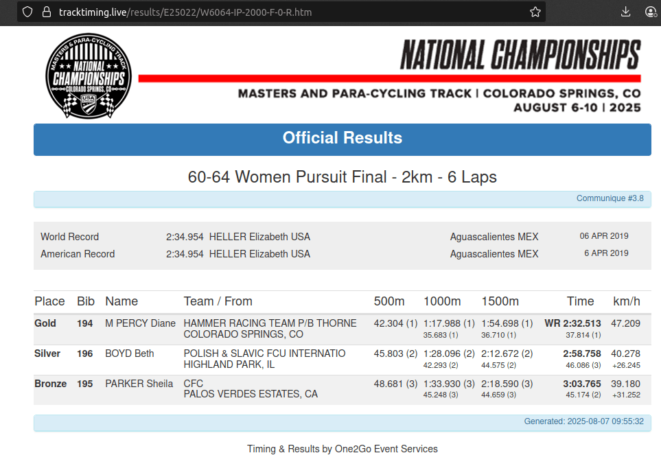 (Information gleaned from the BossVoss Nats Report) Sue Lloyd- Gold- Sprints Gold- Pursuit Gold- 500 TT Louella Holter- Silver- Sprints Gold- Pursuit Gold- 500 Gwenn Afton- Bronze- Sprints Bronze- 500TT Gold - Team Pursuit Gold - Team Sprint Sue Meinerz- Bronze- Sprints Bronze- Pursuit 5th- 500TT Rich Gangl- 10th- Pursuit Ray Gildea- Silver- Sprints Gold- 500TT Gold- Team Sprint Thom Miller- 7th- 500TT 8th - Match Sprint Vincent Basile- 7th - Match Sprint Bryan Krause- 15th- Pursuit 15th- 500 TT Shannon Fox- 5th- Pursuit Silver - Scratch Race 5th - Points Race Gold - Team Pursuit 5th - Team Sprint Count- 10th- Pursuit 6th- 500TT Rich Voss- Bronze- 500TT Gold- Team Sprint Team DAD (Dead Lifts All Day) 6th- (.10 seconds off podium) Vincent Basile, Thom Miller, Bryan Krause If there was a team award, we certainly would have won it.